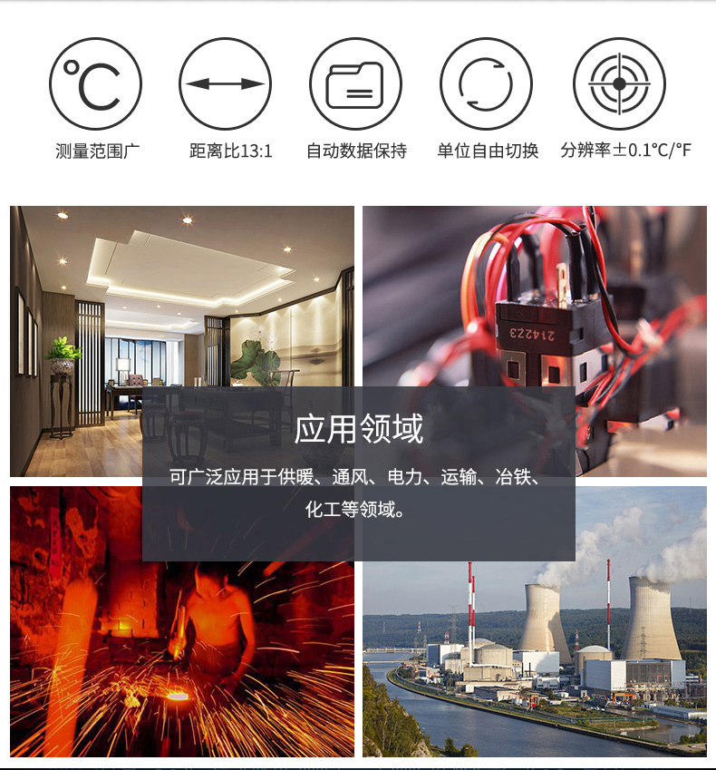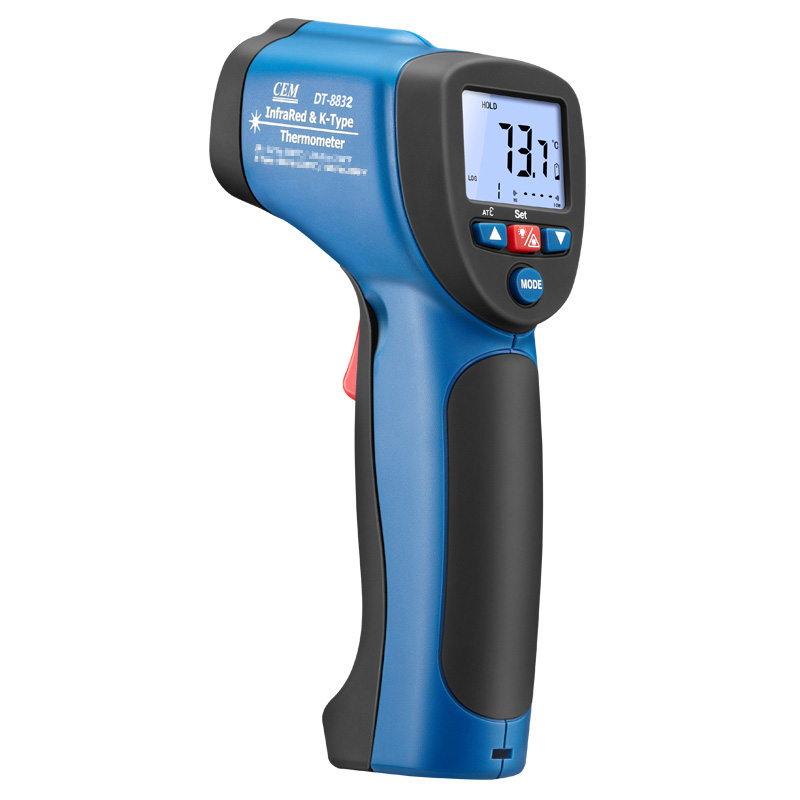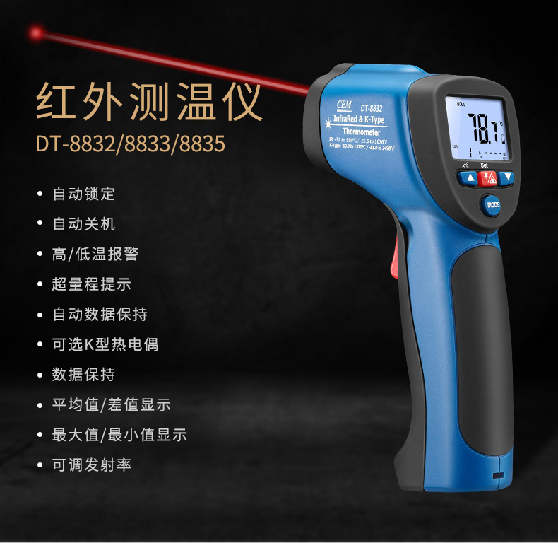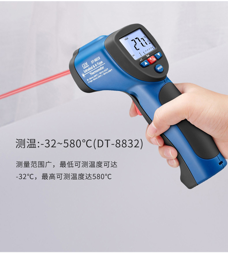 華盛昌DT-8832二合一紅外線測溫儀屬于紅外測溫儀,鋌和華盛昌CEM品牌專區(qū)提供詳細的華盛昌DT-8832二合一紅外線測溫儀介紹,包括華盛昌DT-8832二合一紅外線測溫儀價格、基本參數(shù)、產(chǎn)品特點、華盛昌DT-8832二合一紅外線測溫儀圖片、功能及適用范圍等信息,還有華盛昌DT-8832二合一紅外線測溫儀問答及用戶評價為您選購提供全方位的參考。想了解更多更全的華盛昌CEM紅外測溫儀報價、型號、種類以及使用方法相關(guān)內(nèi)容,可以到華盛昌CEM品牌專區(qū)。 華盛昌DT-8832二合一紅外線測溫儀是紅外測溫和K型溫度測溫結(jié)合的二合一紅外線測溫儀 雙注塑機殼、1米防摔,高達30:1的距離比 帶K型熱點偶測溫,可以根據(jù)您的需要適應(yīng)不同場合的測溫要求。 溫度段從380℃至1050℃滿足測溫場景 ℃/℉溫度單位轉(zhuǎn)換 可達±1.5%測量精度 自動數(shù)據(jù)保持 20個數(shù)據(jù)儲存 最大值/最小值顯示 K型熱電偶測溫(量程設(shè)計-50℃至1370℃) 超亮背光LCD顯示,在暗處也可以輕易測量和讀數(shù) 自動獲取目標的可調(diào)發(fā)射率,可測量不同材質(zhì)的物體表面溫度 距離比D:S=16:1,30:1供選擇,高距離比可遠距離測量更小尺寸目標
