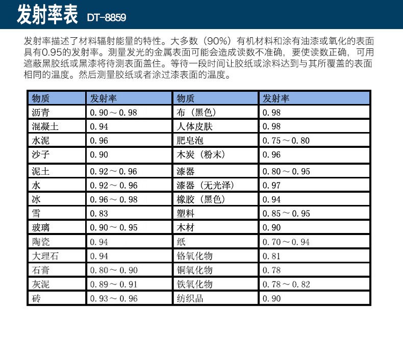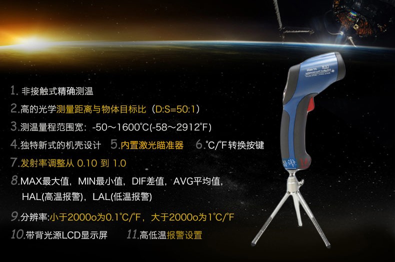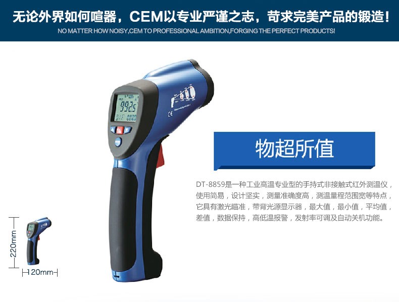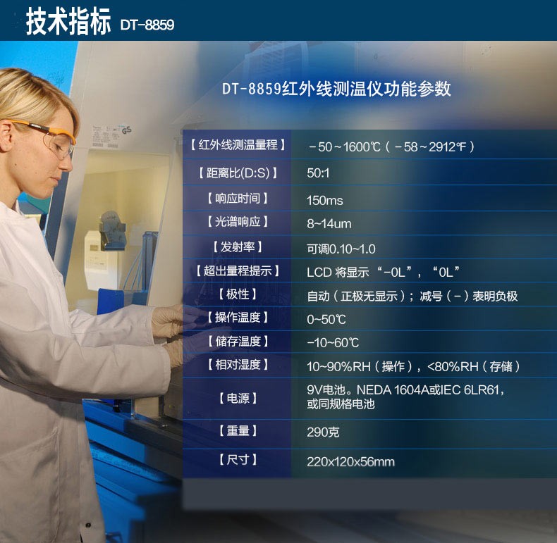DT-8829紅外線測溫儀一種專業(yè)型的手持式非接觸紅外線測溫儀,使用簡易,設計堅實,測量準確度高,測溫量程范圍寬等特點。它具有激光瞄準,帶背光源顯示器,最大值,最小值,平均值,差值,數(shù)據(jù)保持,高低溫報警,發(fā)射率可調及自動關機功能。該手持式非接觸紅外線測溫儀可用于測量那些不適合使用傳統(tǒng)接觸式測量方法來測量物體的表面溫度(例如移動物體,帶電表面和難以接觸到的物體)。特征:非接觸式精確測溫高的光學測量距離與物體目標比(D:S-16;1/50:1)測溫量程范圍寬獨特新式的機殼設計內置激光瞄準器自動數(shù)值保持℃/F轉換按鍵發(fā)射率調整從0.10 到1.0,(8829固定在0.95)MAX,MIN,DIF,AVG 溫度顯示帶背光源LCD顯示屏自動選擇量程,分辨率為0.1