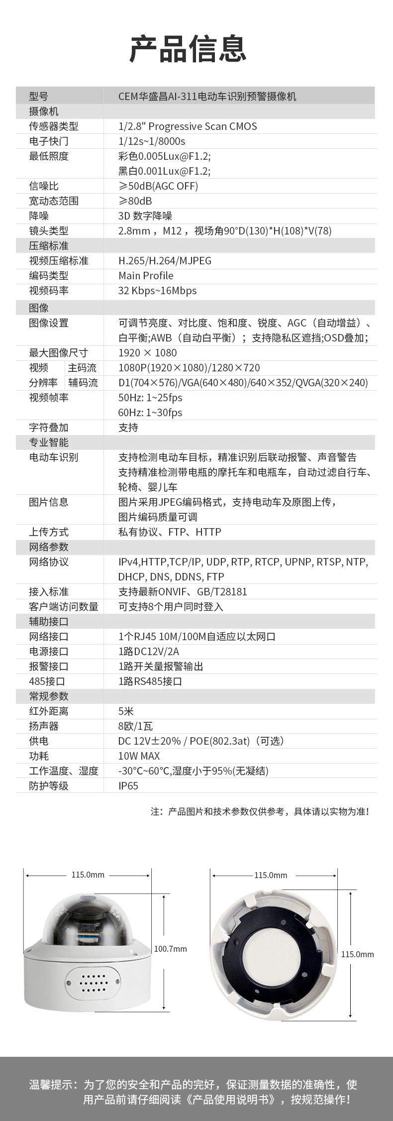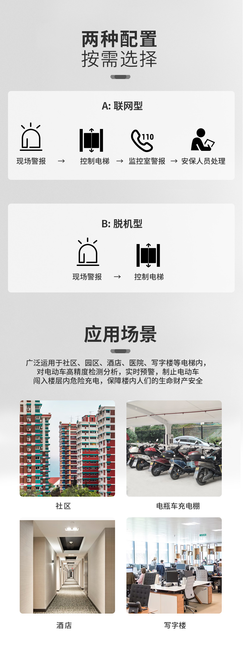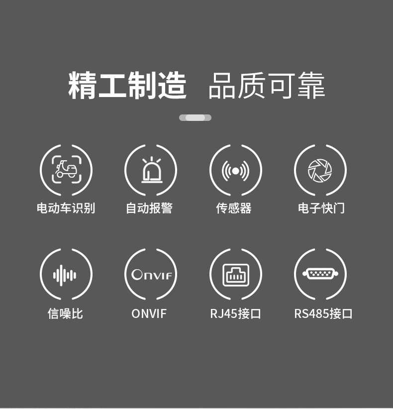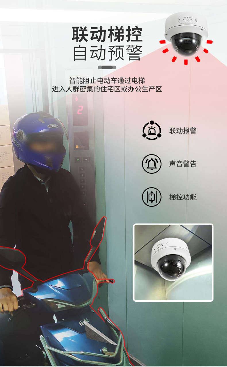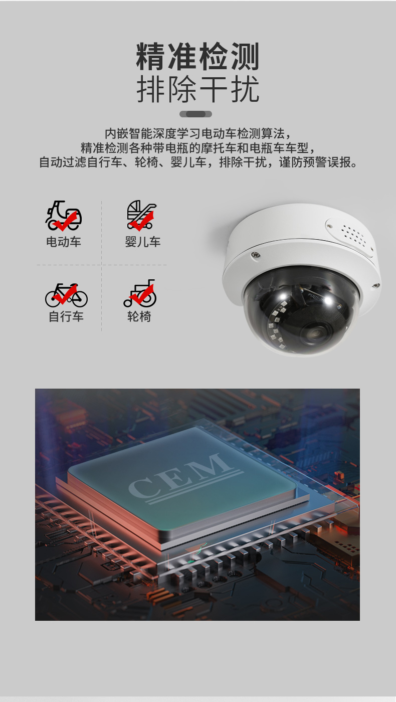 電動車識別預警攝像機:電動車識別預警攝像機設(shè)備嵌入電動車識別算法,實現(xiàn)對電動車檢測分析識別,實時預警周界區(qū)域內(nèi)電動車闖入事件,前端攝像機一體化完成分析、識別、預警,并上傳平臺。