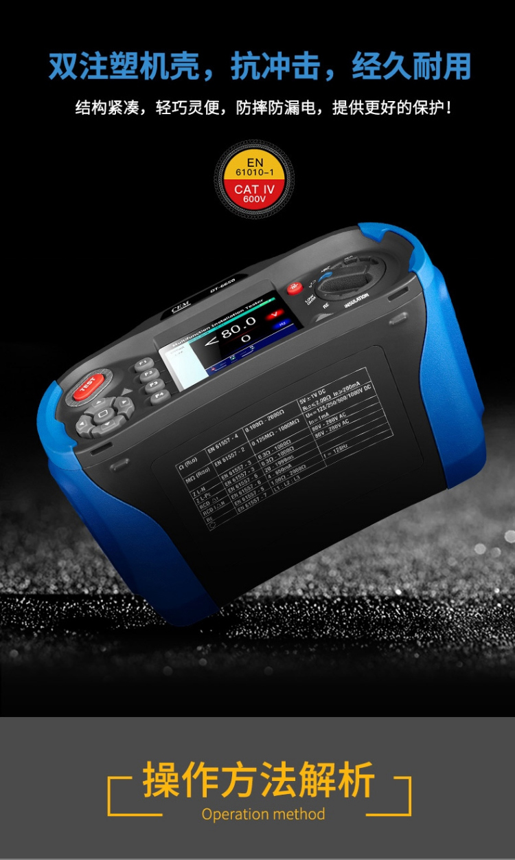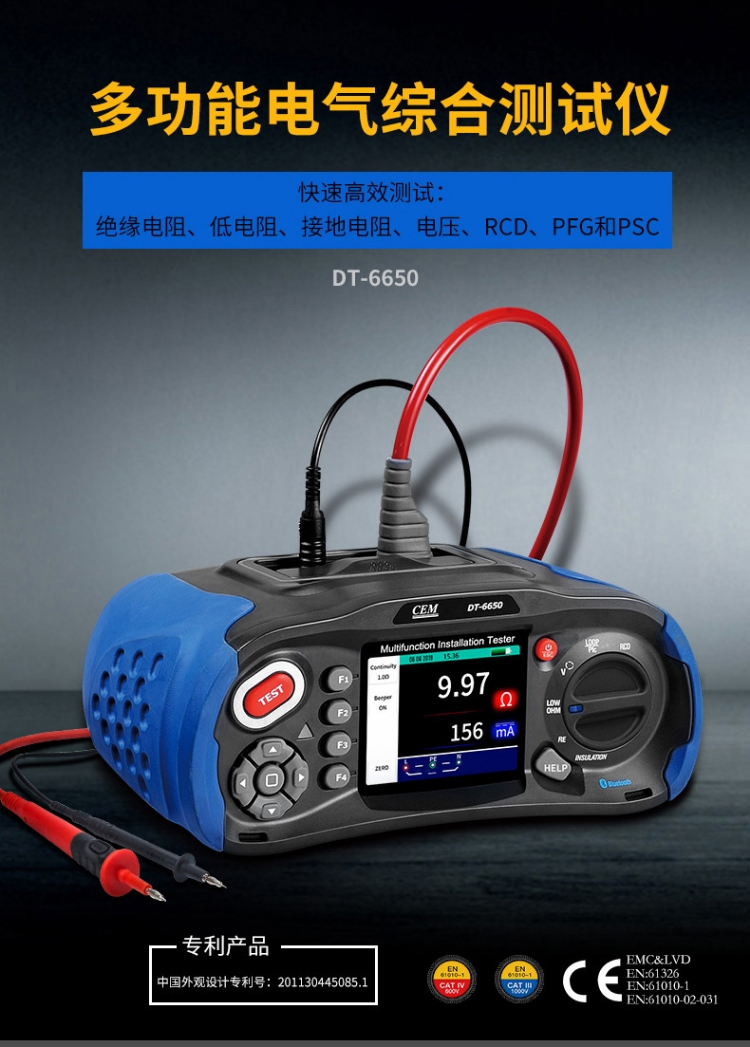 CEM DT-6650專業(yè)的多功能電氣綜合測試儀, 3.5"高清彩色TFT液晶顯示屏,雙注塑機(jī)殼,可測絕緣電阻、接地電阻、低電阻、回路電阻、電壓、RCD、PFG和PSC,并有配套軟件系統(tǒng),同時具有快速取樣、雙顯示、清晰的按鍵和大屏等優(yōu)點,方便用戶簡單清晰地操作,可以確保電氣裝置在家庭、商業(yè)、工業(yè)等領(lǐng)域應(yīng)用的安全性,以及固定接線安裝的安全性和準(zhǔn)確性,是電力電氣領(lǐng)域的專業(yè)電力檢驗工具。