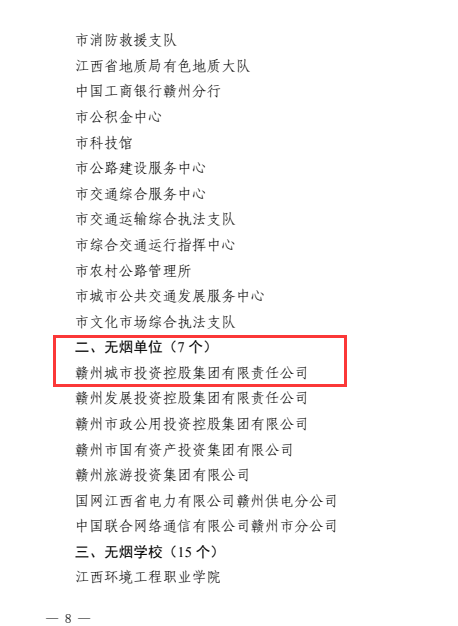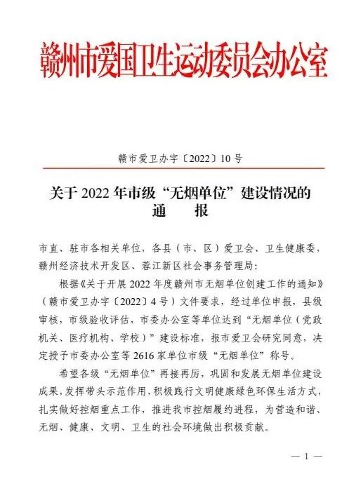 自開展“無煙單位”創(chuàng)建工作以來,集團(tuán)積極貫徹落實(shí)《贛州市控?zé)熜袆訉?shí)施方案(2020-2030年》(健康贛州辦發(fā)〔2020〕14號)精神,結(jié)合工作實(shí)際,嚴(yán)格對照無煙單位創(chuàng)建標(biāo)準(zhǔn),通過積極引導(dǎo)、完善制度、健全機(jī)構(gòu)、明確責(zé)任、強(qiáng)化監(jiān)督,促使廣大員工深刻認(rèn)識到吸煙的危害,集團(tuán)吸煙行為得到了有效控制,控?zé)煿ぷ魅〉昧嗣黠@成效,于2022年5月順利通過了贛州市愛國衛(wèi)生運(yùn)動委員會的檢查驗(yàn)收。