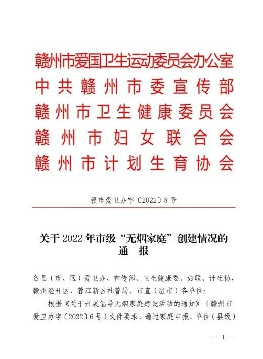 5月31日,在贛州市第35個世界無煙日“煙草危害環(huán)境”主題宣傳活動會議上,贛州市愛國衛(wèi)生運(yùn)動委員會公布了2022年市級“無煙單位” 、“無煙家庭”名單。贛州城投集團(tuán)榮獲“市級無煙單位”榮譽(yù)稱號,五名員工家庭喜獲“無煙家庭”榮譽(yù)稱號。