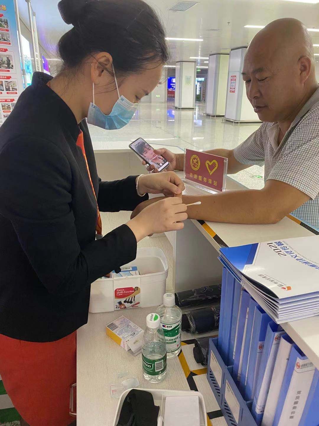 6月6日,一位男士來到贛州西站黨員服務窗口詢問是否有創(chuàng)可貼,經了解,該旅客手部因不慎刮傷流血不止,值班人員察看傷口后,迅速先幫旅客采取酒精消毒,再熟練地用創(chuàng)可貼包扎好傷口。該男士連聲道謝,露出了滿意的笑容。