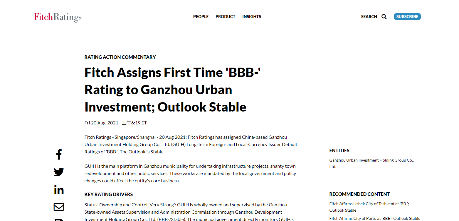 日前,經(jīng)國(guó)際權(quán)威信用評(píng)級(jí)機(jī)構(gòu)之一——惠譽(yù)國(guó)際信用評(píng)級(jí)公司評(píng)定:贛州城投集團(tuán)首次國(guó)際信用評(píng)級(jí)為BBB-,信用評(píng)級(jí)展望