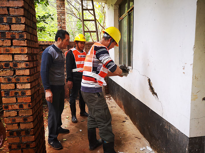 收到群眾訴求后,贛州建工集團黨支部明確責任分工,由贛州建工集團駐蓉江花園(四區(qū))項目部的工作人員前往實地了解情況。該村村民邱家飛年近七旬,所居住的房屋因年久失修,導(dǎo)致門廳墻面破損,房屋內(nèi)外均存在一定程度的裂縫。此外,村里另有一對姐弟居住的房屋由于結(jié)構(gòu)問題也存在幾處裂縫。