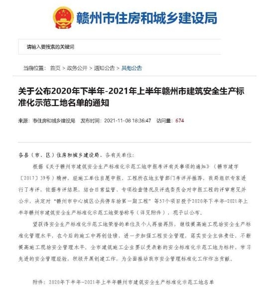 日前,贛州市住房和城鄉(xiāng)建設局公布了2020年下半年-2021年上半年贛州市建筑安全生產標準化示范工地名單,由贛州城投集團建設的贛州市章江新區(qū)農民返遷房項目(BT建設)第四標段K22地塊、星洲萃苑(一期)、中科院贛江創(chuàng)新研究院一期新建項目共3個項目獲獎。
